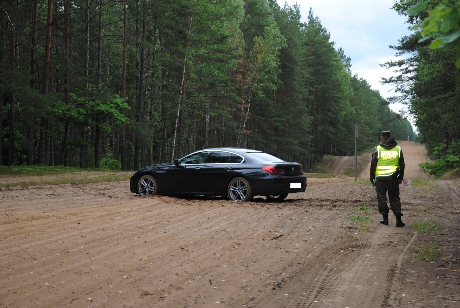 W piątek rano na terenie powiatu sejneńskiego kierowca BMW 640D Gran Coupe na litewskich numerach rejestracyjnych nie zastosował się do sygnałów podawanych przez funkcjonariuszy do zatrzymania się. Przyśpieszył i zawrócił w kierunku Berżnik. Tam czekał na niego kolejny patrol, jednak i tym razem kierowca zignorował sygnał do zatrzymania się i przejechał po kolczatce drogowej. Za uciekającym autem rozpoczęto pościg. Kierowca wjechał na pas drogi granicznej w rejonie Stanowiska, gdzie utknął, dalej kontynuował ucieczkę pieszo. Porzucony pojazd figurował w bazie Systemu Informacyjnego Schengen jako skradziony w Niemczech. W samochodzie znajdowały się oryginalne niemieckie tablice rejestracyjne. Podjęte działania doprowadziły do zatrzymania sprawcy, którym okazał się 30-letni obywatel Litwy. Ponadto ustalono, że zatrzymany obywatel Litwy w trakcie ucieczki dokonał wejścia na pas drogi granicznej za co został ukarany mandatem karnym.