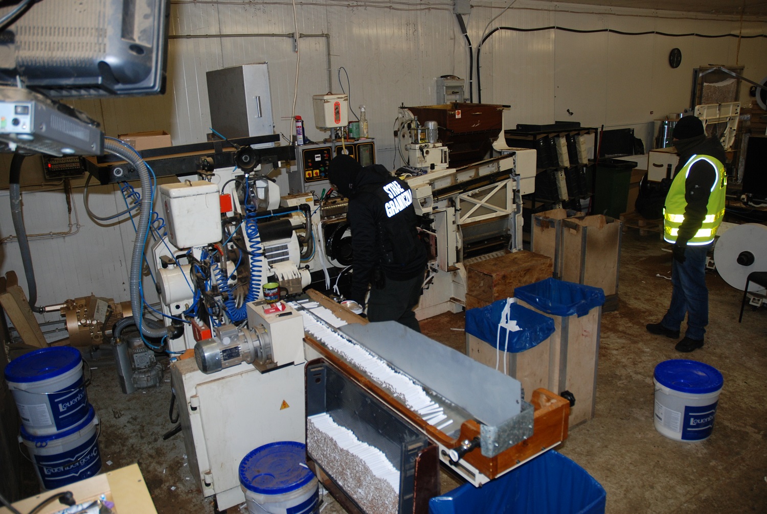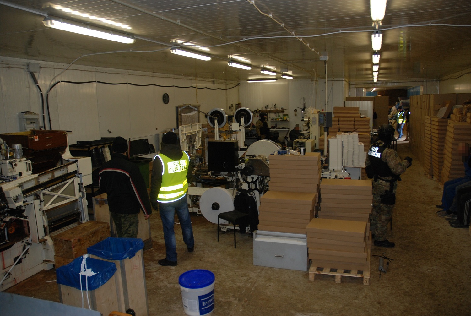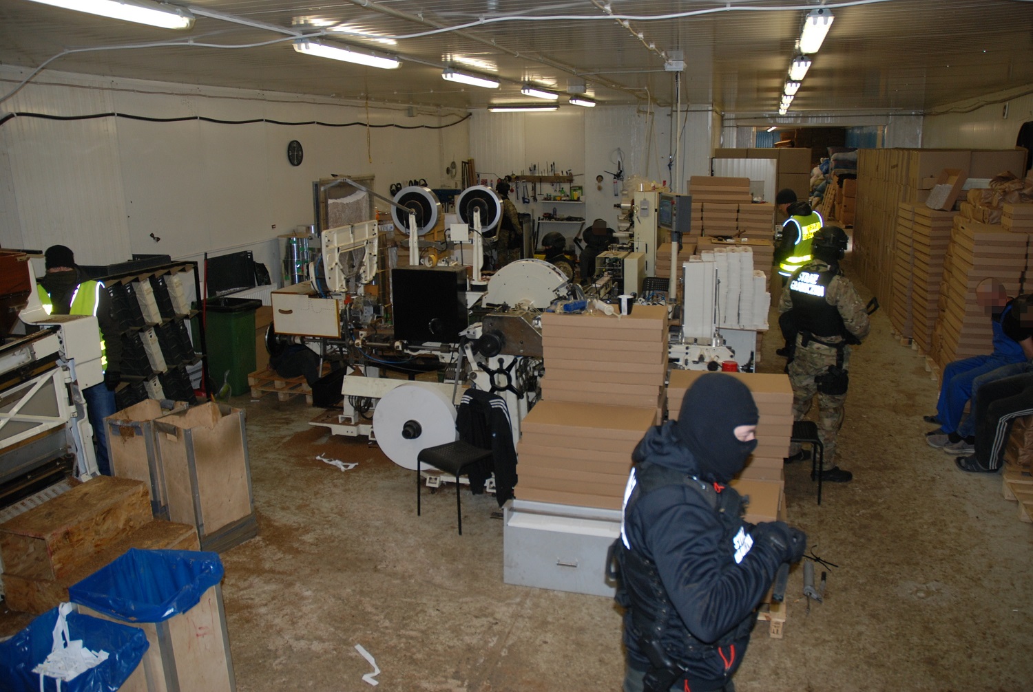 Cudzoziemcy – obywatele Ukrainy w wieku od 23 do 59 lat zostali zatrzymani na gorącym uczynku podczas produkcji nielegalnych papierosów. W momencie wejścia do fabryki funkcjonariusze zastali działające w niej 2 kompletne linie produkcyjne. W skład profesjonalnych, o wysokim standardzie linii wchodziły maszyny produkujące krajankę, suszące tytoń, aromatyzujące tytoń, produkujące papierosy, pakowarki. Jedna maszyna wytwarzała 6 tys. papierosów na minutę, a maszyna pakująca pakowała 250 paczek na minutę. Nielegalne papierosy prawdopodobnie przeznaczone były na rynek Europy Zachodniej i Polski.