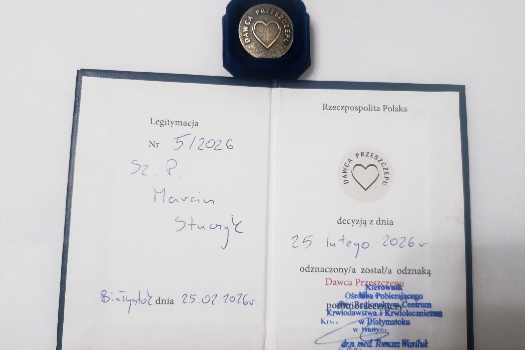 Funkcjonariusz Podlaskiego Oddziału Straży Granicznej - mł. chor. SG Marcin Stuczyk, służbę w Straży Granicznej rozpoczął w 2008 roku w Placówce SG w Szudziałowie, gdzie do dzisiaj realizuje zadania w ochronie granicy państwowej. Na co dzień mąż i ojciec, honorowy dawca krwi, w służbie profesjonalista. Zawsze gotowy do działania, zawsze chętny do pomocy, zawsze wrażliwy na ludzką krzywdę i cierpienie. Pewnego dnia, jak wielu z nas zarejestrował się jako potencjalny dawca szpiku z myślą, że może kiedyś gdzieś ktoś, będzie potrzebował pomocy innej niż zwykle – „daru życia”. I stało się. W lutym zadzwonił telefon. Potrzebne dodatkowe badania. Wynik - parametry pobranej od mundurowego próbki są zgodne z potrzebami jednego z pacjentów.