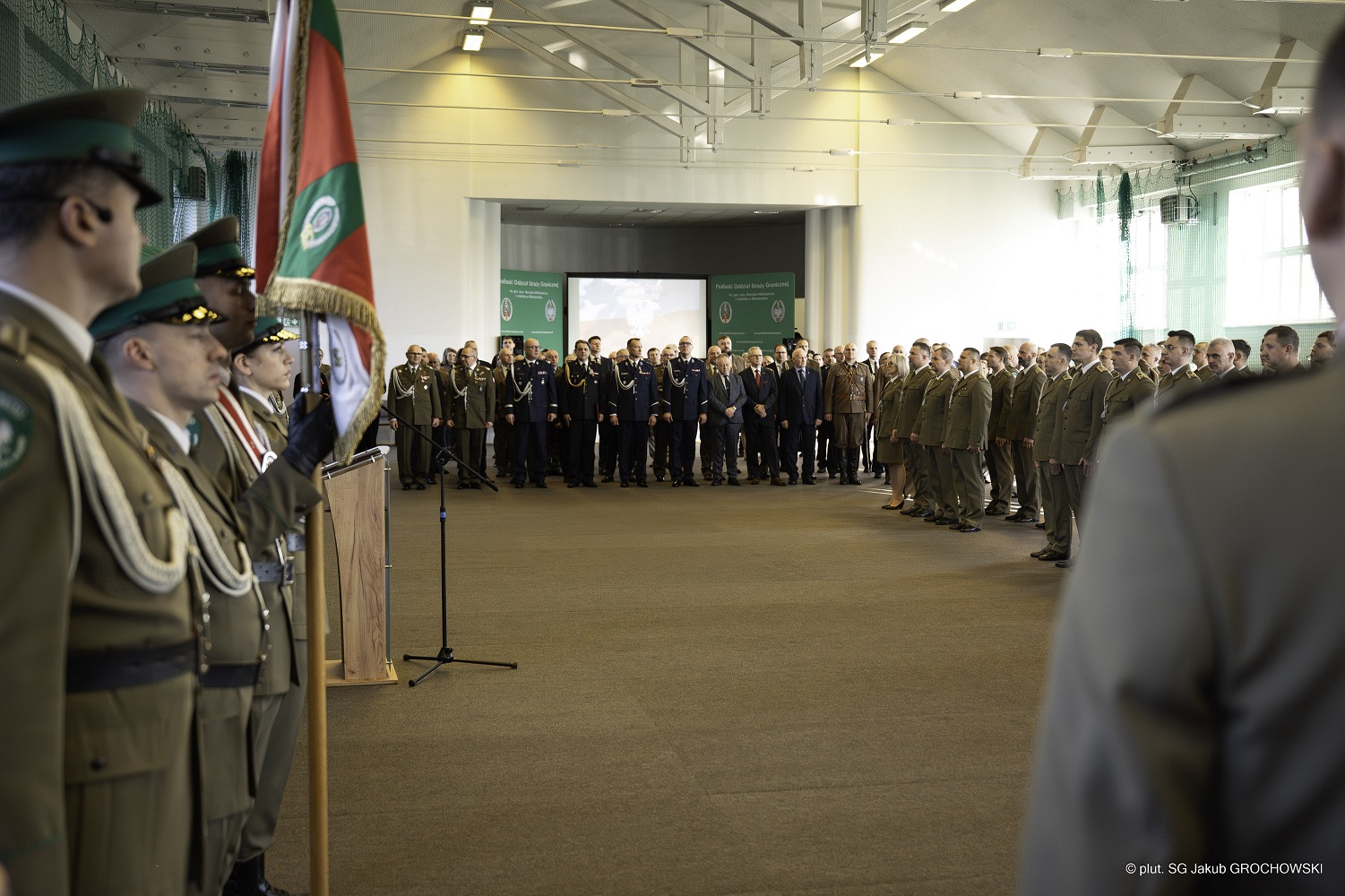 Wczorajszą uroczystość (19.11.2025 r.) rozpoczął Komendant Podlaskiego Oddziału Straży Granicznej gen. bryg. SG Sławomir Klekotka witając przybyłych gości. W swoim wystąpieniu mówił o tym, jak ważnym wydarzeniem dla Polski, po 123 latach niewoli, było odzyskanie niepodległości. Przypomniał o tym, iż obecna Straż Graniczna wywodzi się ze swoich przedwojennych poprzedników Korpusu Ochrony Pogranicza, których misję kontynuujemy z dumą, stojąc na straży bezpieczeństwa i integralności terytorialnej Polski. Na zakończenie przemówienia generał pogratulował wyróżnionym i jednocześnie podziękował wszystkim funkcjonariuszkom i funkcjonariuszom oraz pracownikom za ciężką i odpowiedzialną służbę i pracę.