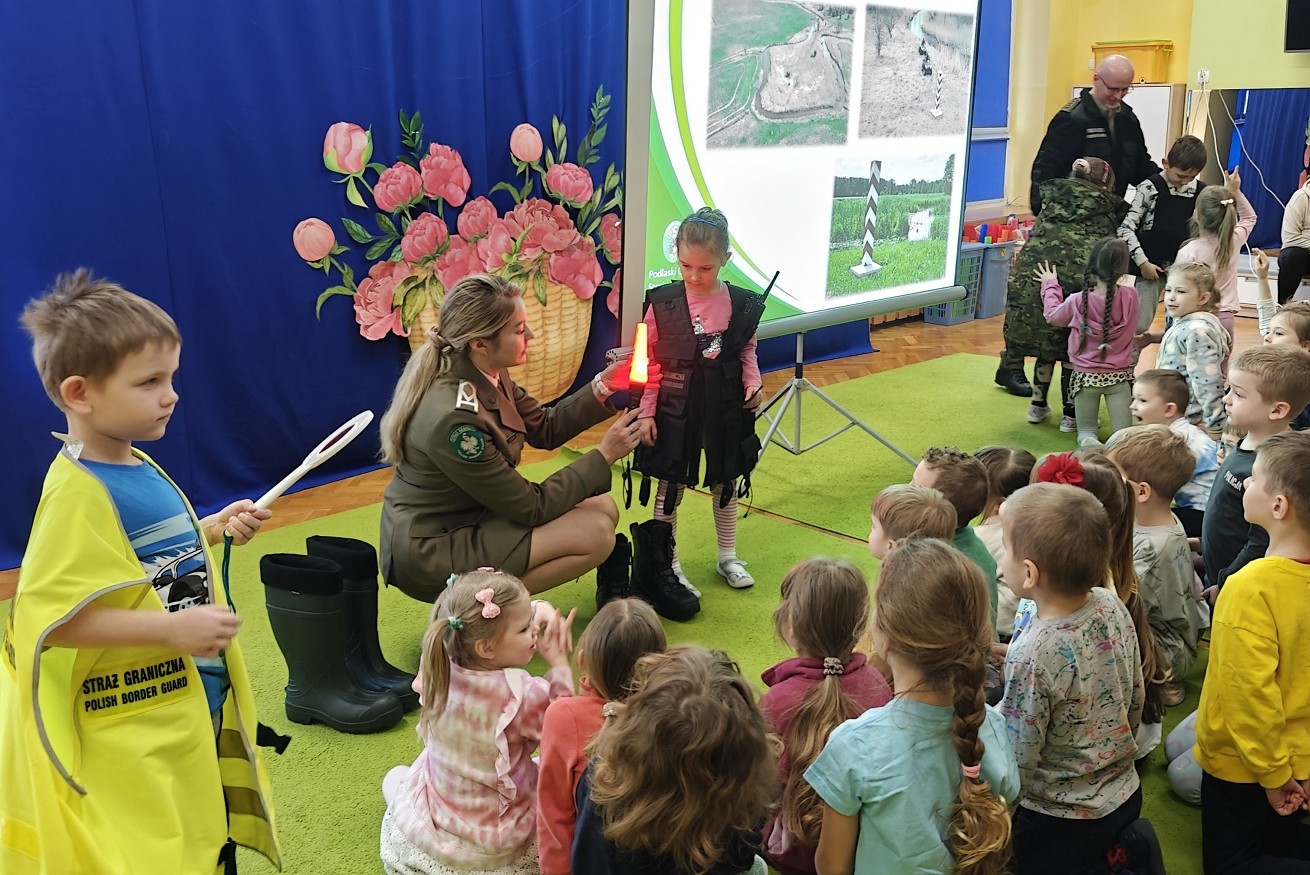 Na spotkanie z dziećmi udali się także funkcjonariusze nowo powstałej Placówki SG w Białymstoku. Odwiedzili uczniów Szkoły Podstawowej nr 50 z Oddziałami Integracyjnymi im. Św. Jadwigi Królewskiej Polski w Białymstoku oraz przedszkolaki z Przedszkola Samorządowego Nr 64 pn. „Akademia Jasia i Małgosi” w Białymstoku. Funkcjonariusze zapoznali dzieci ze specyfiką służby, codziennymi obowiązkami i zadaniami. Zaprezentowano najmłodszym umundurowanie oraz sprzęt, w który wyposażeni są funkcjonariusze oraz przybliżono zasady jego działania. Dzieci mogły założyć elementy stroju oraz uczestniczyć w pokazach niektórych czynności służbowych. Wizyta była wspaniałą lekcją patriotyzmu i omówieniem roli Straży Granicznej w aspekcie zapewnienia bezpieczeństwa i porządku publicznego w kraju.